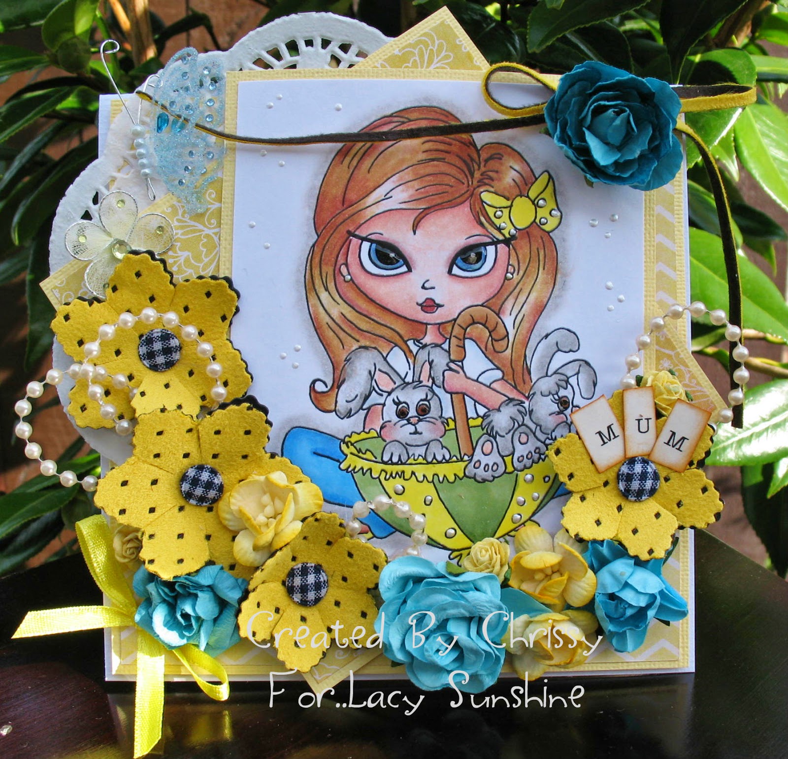 GORGEOUS card that colour combo, the image, design, doilies ribbon oh everything here Chrissy is adorable....well done my friend...had rain here too but not pouring down.xxx