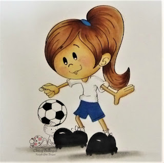 Love the little soccer girl. Great colouring on this, especially her hair... I keep looking back to it. The dotty paper is so pretty and I like how you've offset the image.