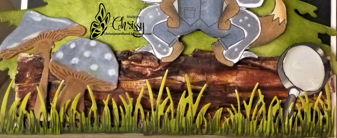 Tree dies...masking tape log...grass dies....toadstool dies..lots going on but really quite a simple card.